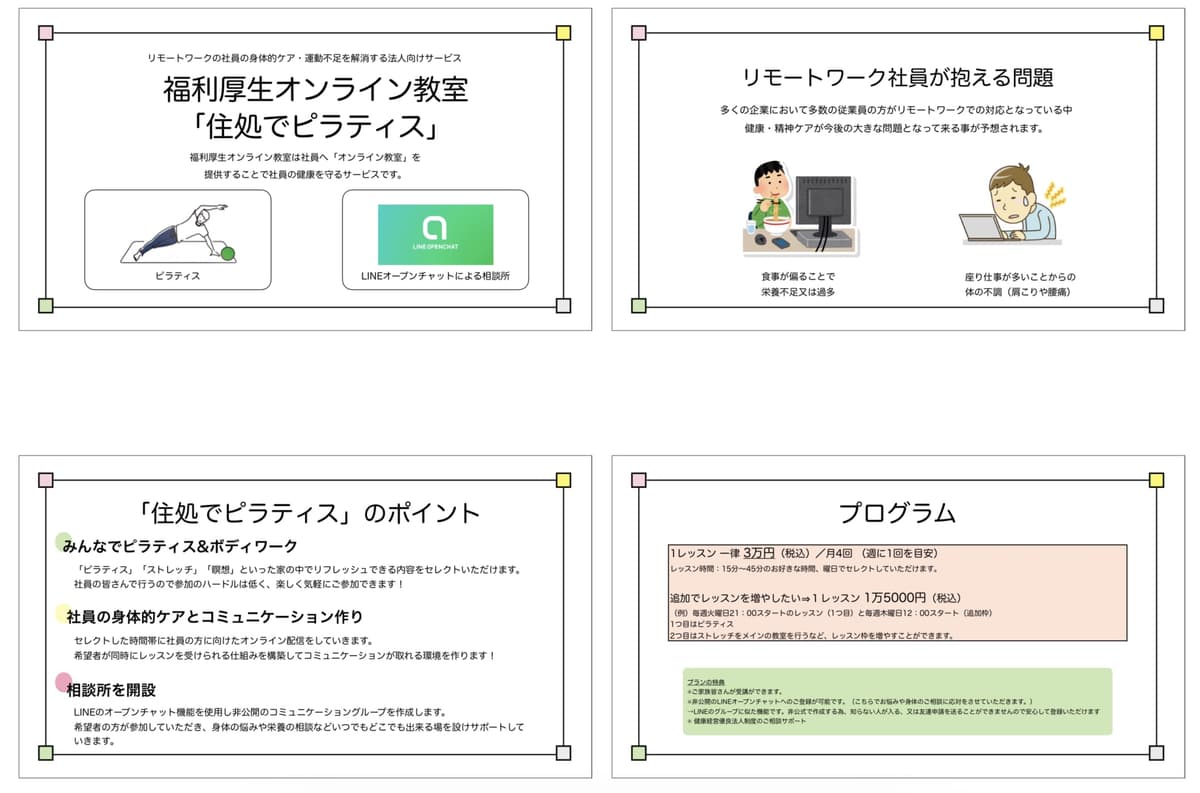 レッスンは月4回(週1回)を目安に行なっていきます。曜日、時間、レッスン内容は従業員の方のお声を反映させて決めていきます。「ピラティスレッスン」「ストレッチ」「肩こり予防」など様々な内容をセレクトしていただけます。下記は内容を資料としてまとめました。ご覧ください。