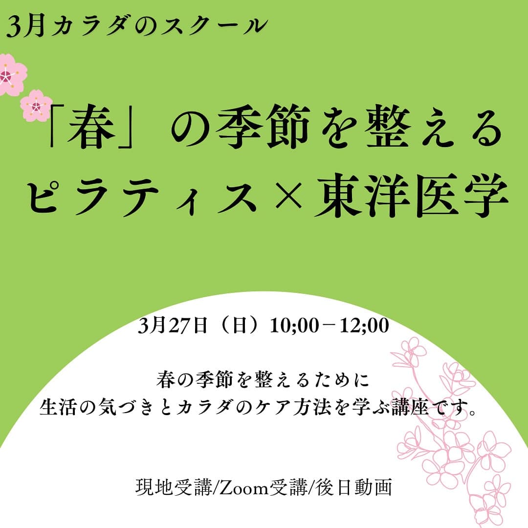 3月のカラダのスクールのテーマは「春」の季節を整えるピラティス×東洋医学この講座は春の季節を整えるために、生活の気づきとカラダのケア方法を共有します。