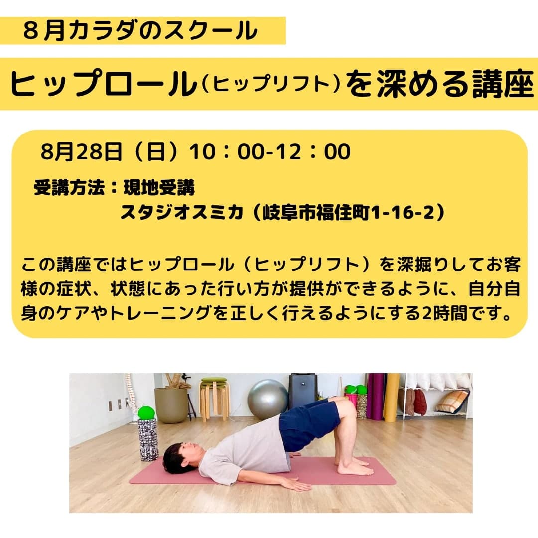 8月のカラダのスクールのテーマはヒップロール(ヒップリフト・ブリッジ)を深める講座を行います。